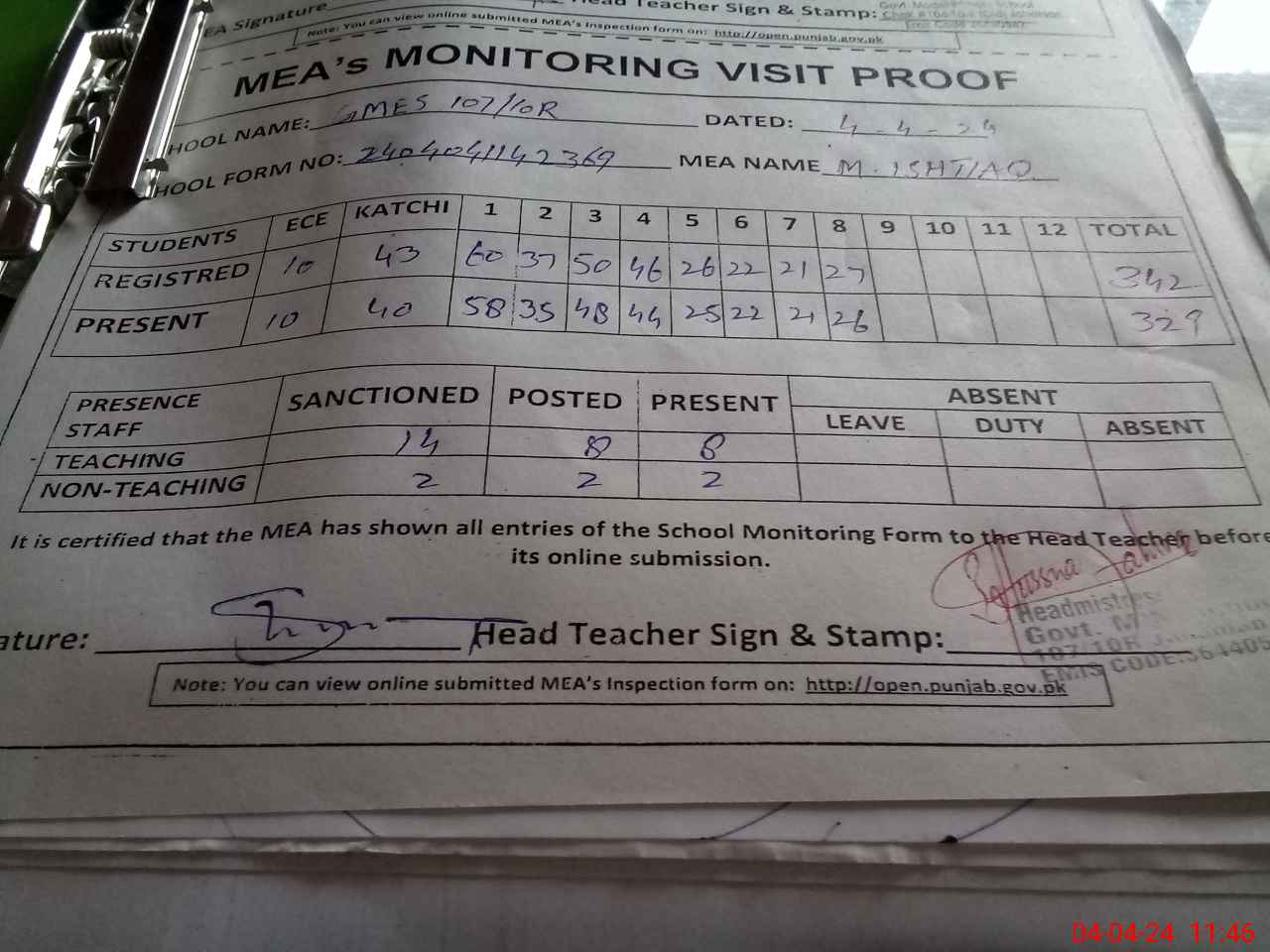 | Certified that this School was Inspected by the Undersigned MEA/DMO Today and the Information Stated Above is as Per Record. | |||||