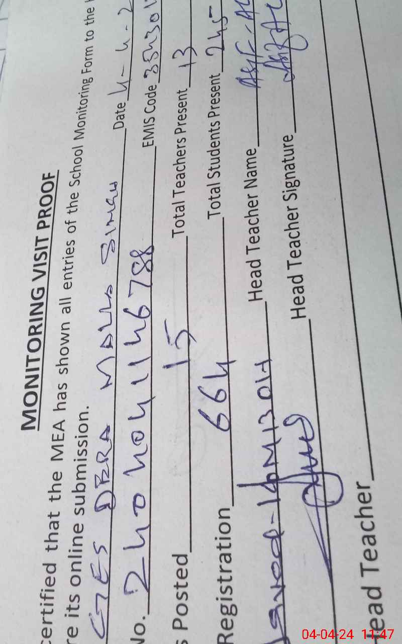 | Attendance Register | Head Teacher | MEA with School | Visit Proof |
