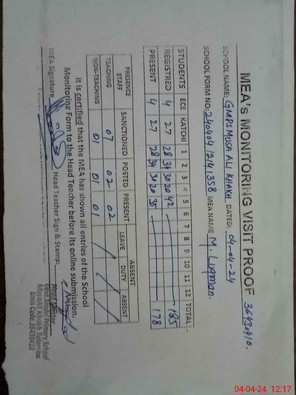 | Attendance Register | Head Teacher | MEA with School | Visit Proof |