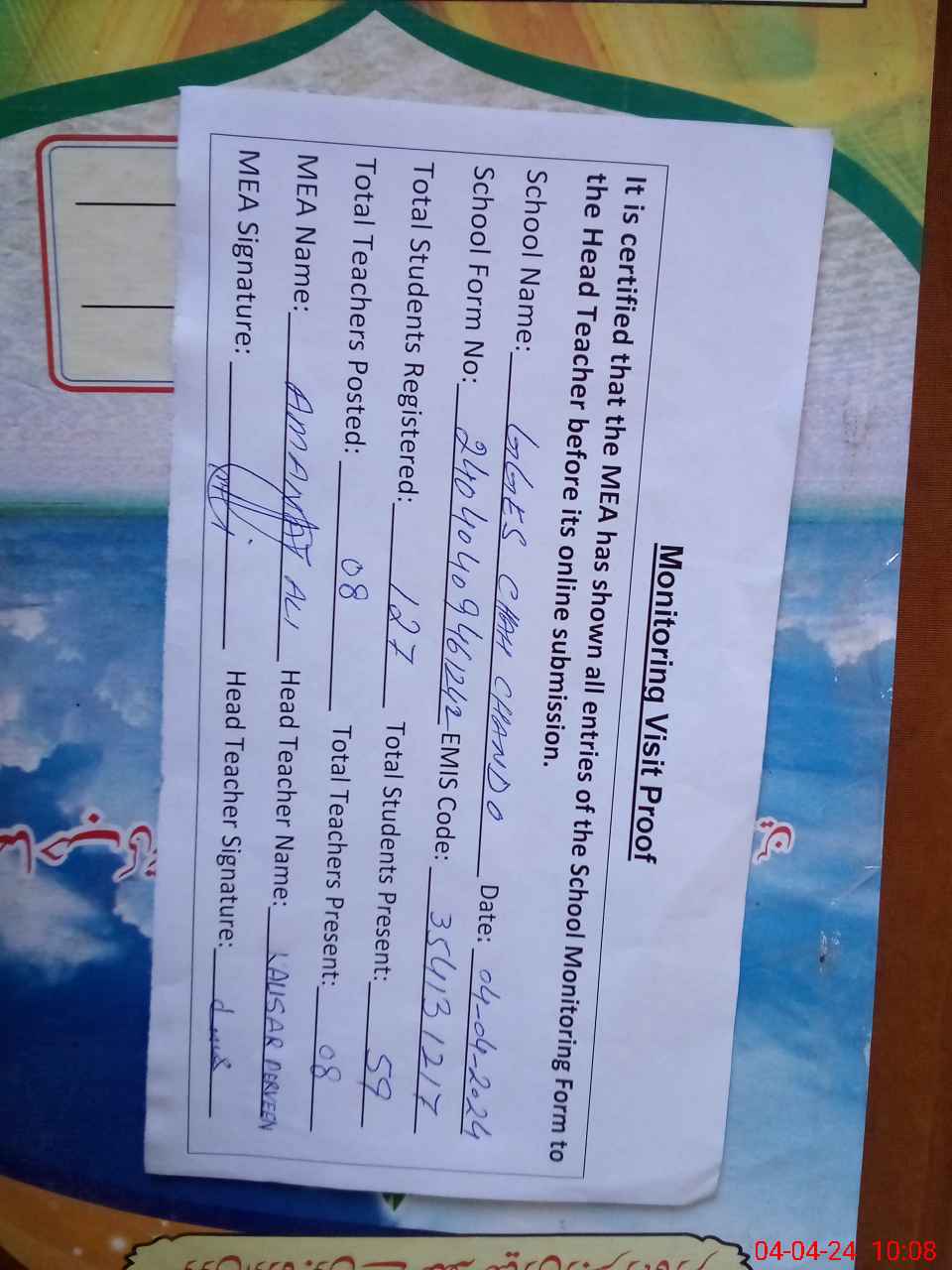 | Attendance Register | Head Teacher | MEA with School | Visit Proof |