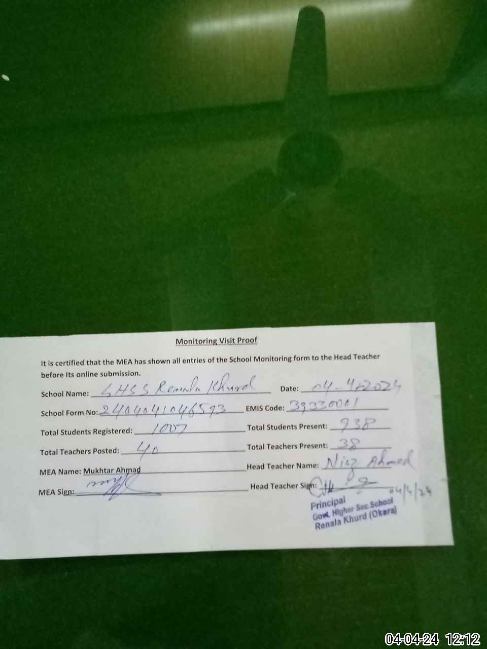 | Attendance Register | Head Teacher | MEA with School | Visit Proof |