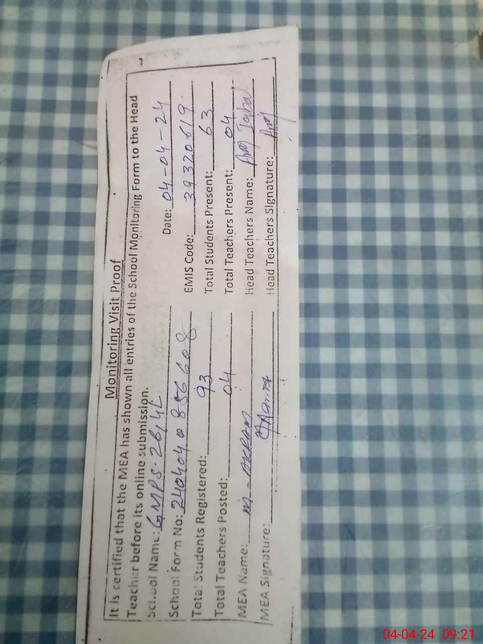 | Attendance Register | Head Teacher | MEA with School | Visit Proof |
