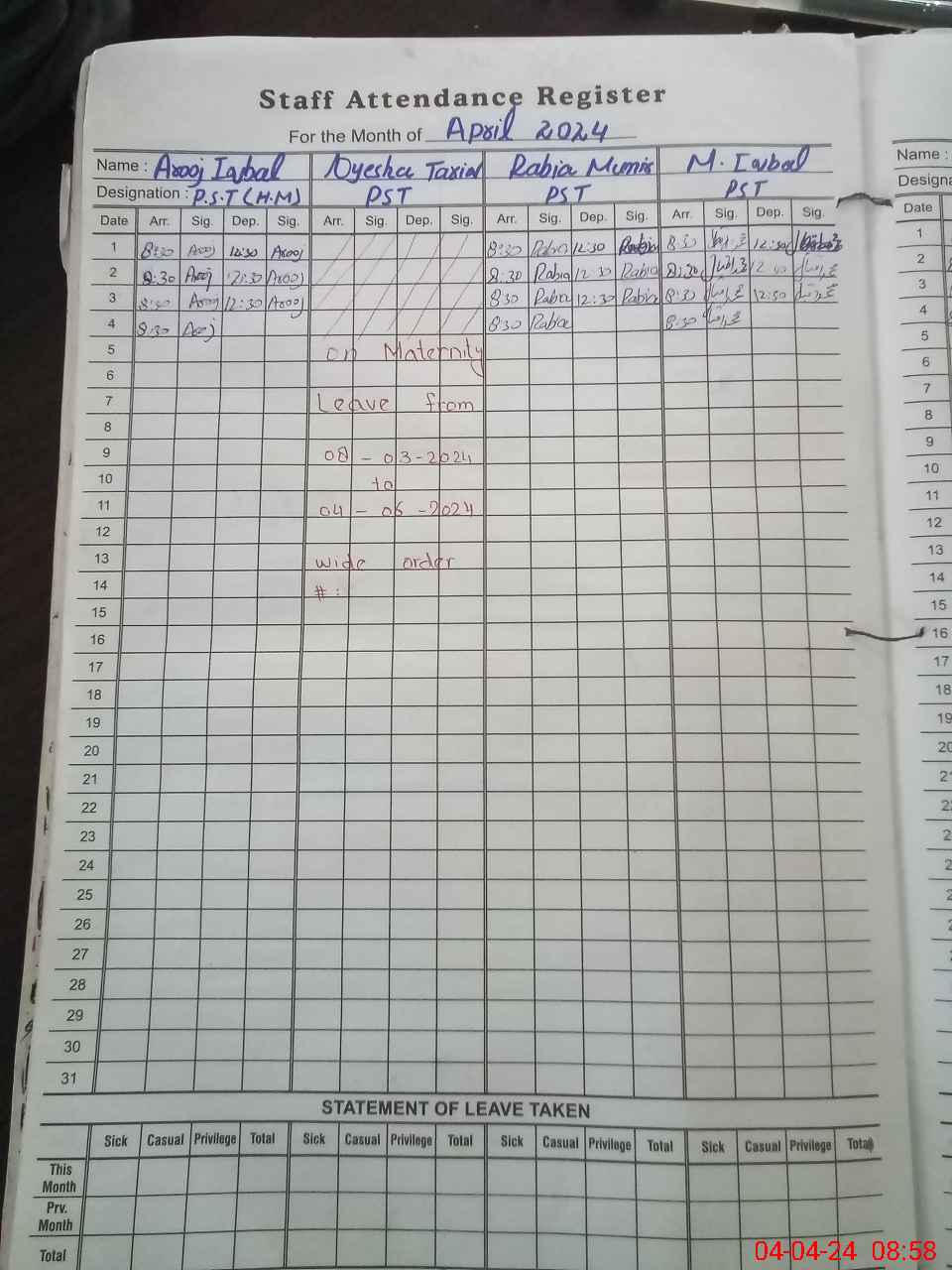 | 36**** | Ay**** Ta**** | PST | Regular | 20 | 0 | 0 | 20 | 0 | 0 | 0 | 0 | 0 | Maternity |
