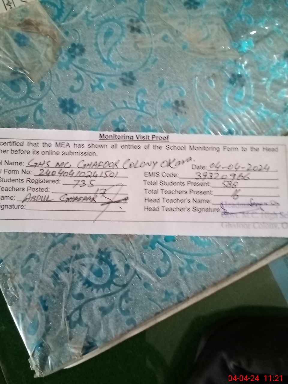| EMIS Code: 39320966 | Name of School: GHS MC GHAFOOR COLONY OKARA | |||