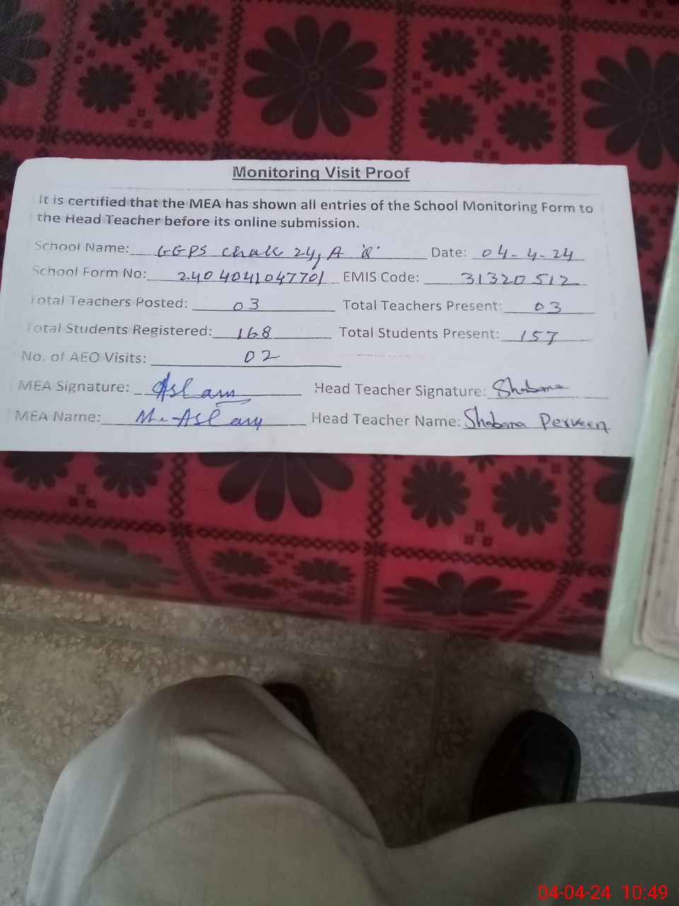 | Attendance Register | Head Teacher | MEA with School | Visit Proof |