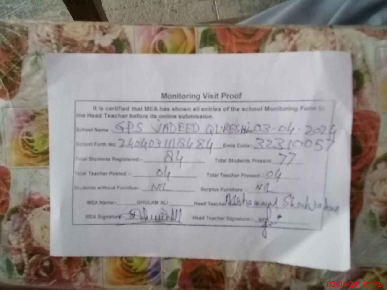 | Attendance Register | Head Teacher | MEA with School | Visit Proof |