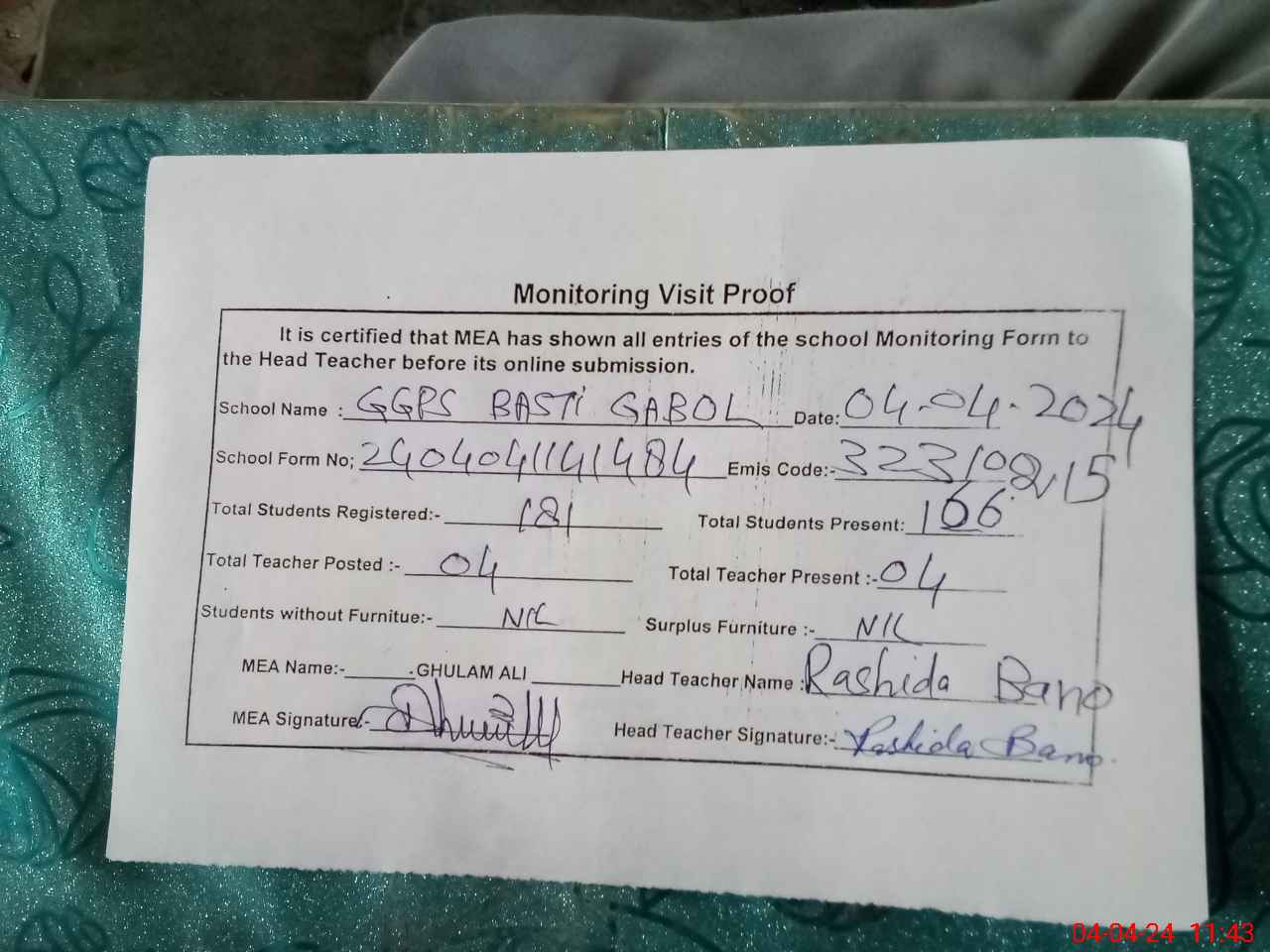 | Monitoring Date: 04-04-2024 | Start Time: 04-04-2024 11:15 AM | End Time: 04-04-2024 11:44 AM | Name of MEA: Gh**** Al**** | |