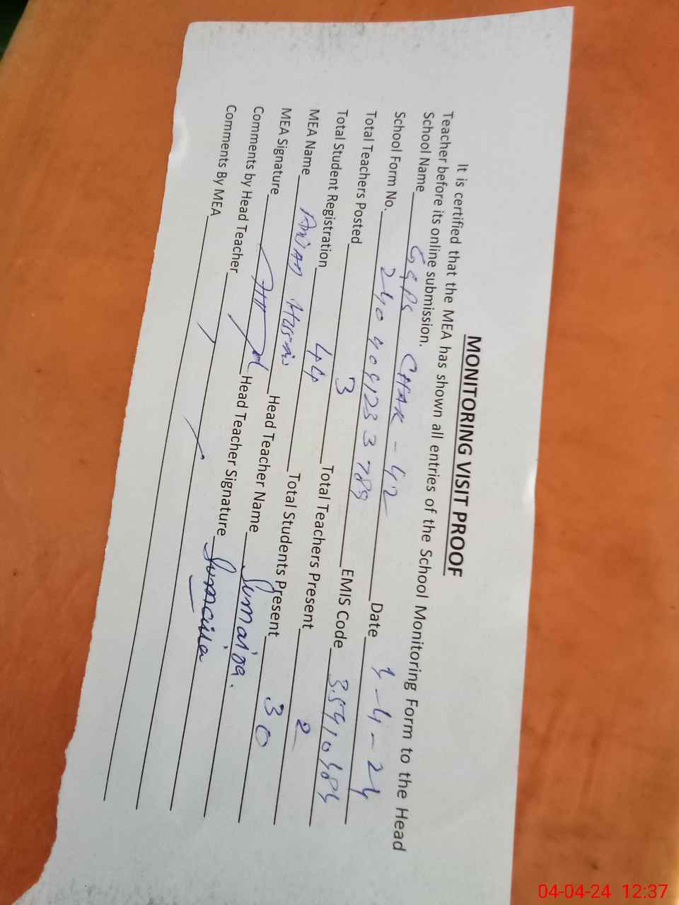 | Attendance Register | Head Teacher | MEA with School | Visit Proof |