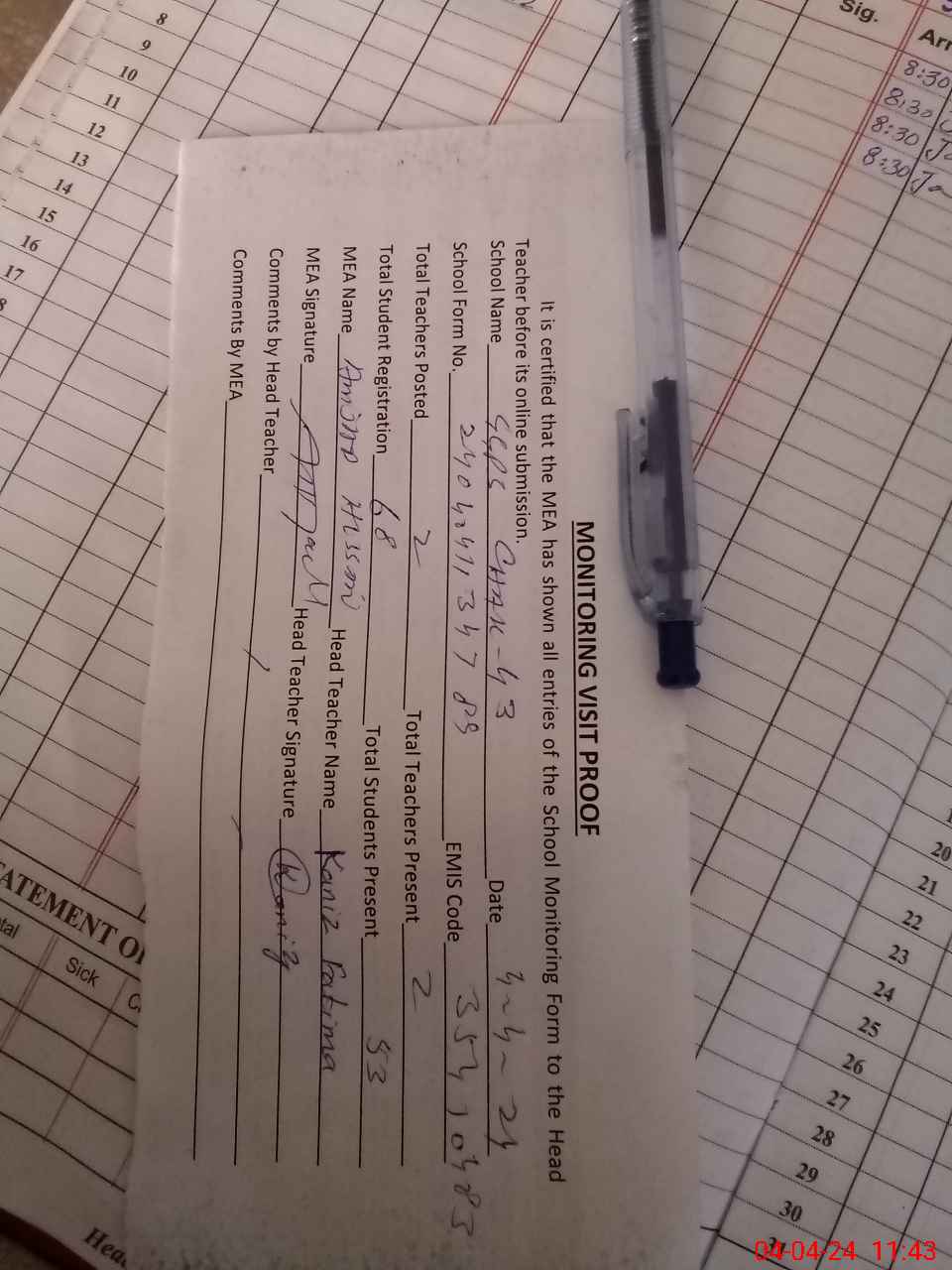 | Attendance Register | Head Teacher | MEA with School | Visit Proof |