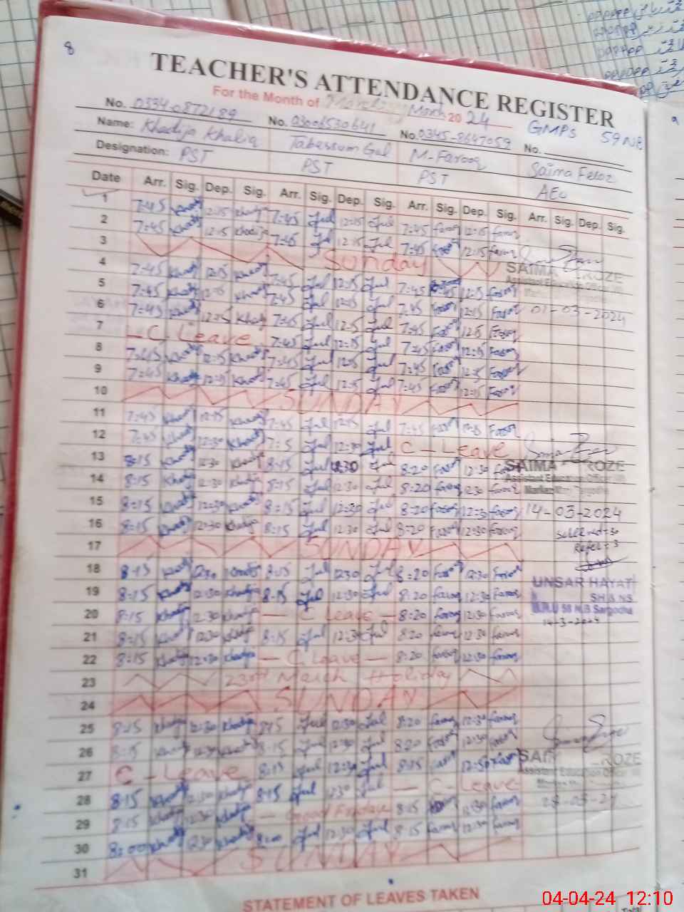 | Name: Kh**** Kh**** Designation: (School Headmaster's/Headmistress's) PST Phone/Cell Number: 03**** |