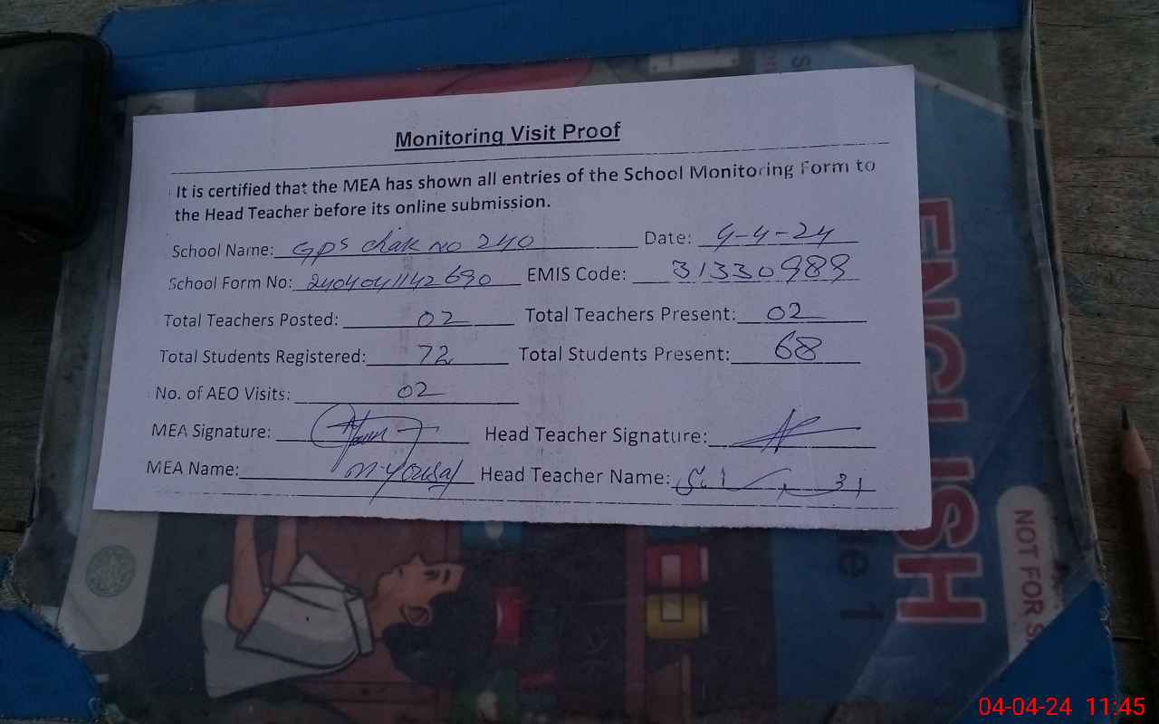 | EMIS Code: 31330989 | Name of School: GPS CHAK NO. 240/P | |||