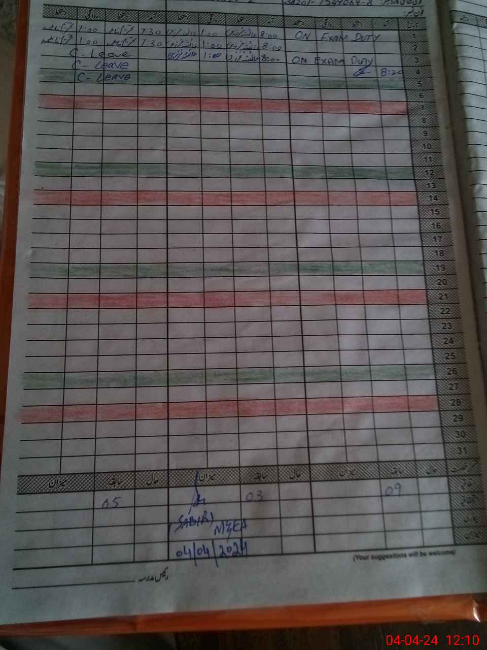 | Leave | Duty | Absent | Maternity | Medical | Ex- Pak |