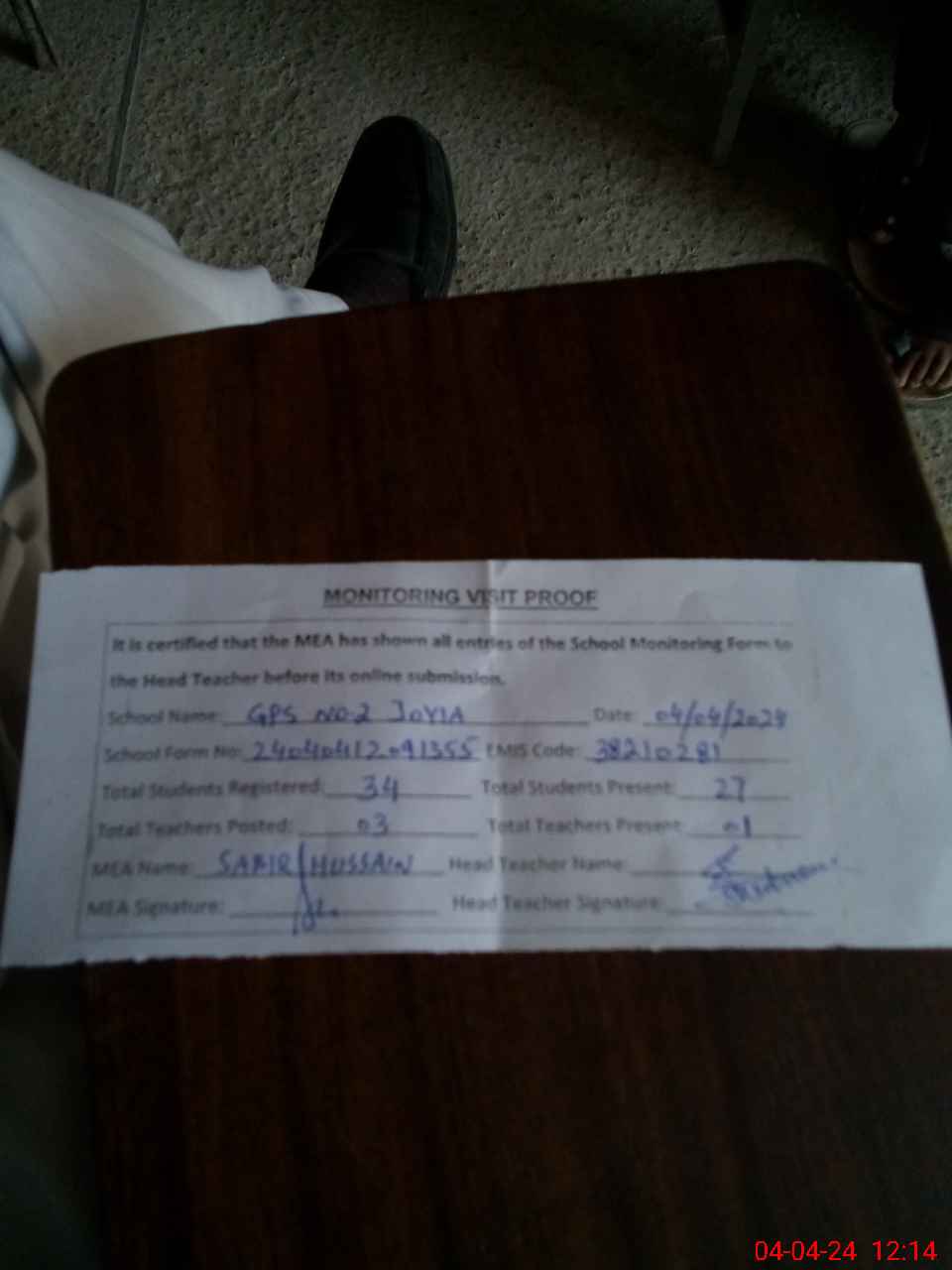 | Attendance Register | Head Teacher | MEA with School | Visit Proof |