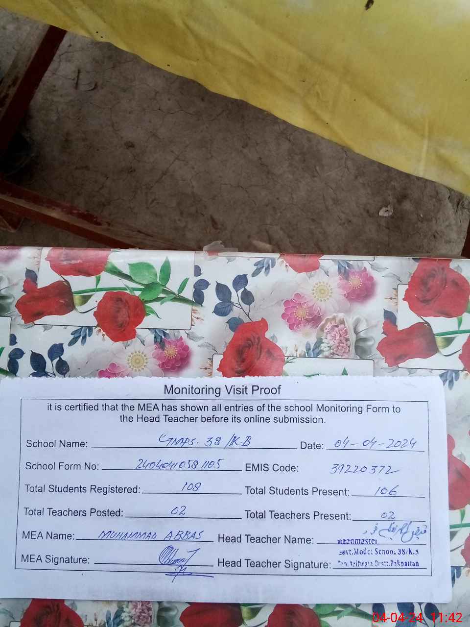 | EMIS Code: 39220372 | Name of School: GMPS CHAK NO 38 KB | |||