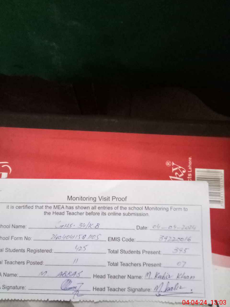 | Attendance Register | Head Teacher | MEA with School | Visit Proof |