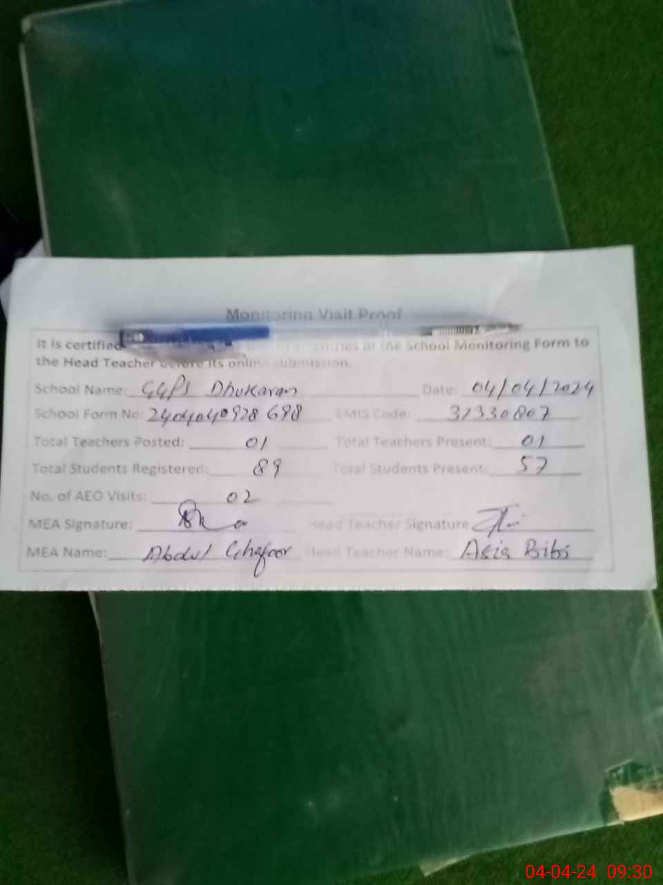 | Attendance Register | Head Teacher | MEA with School | Visit Proof |