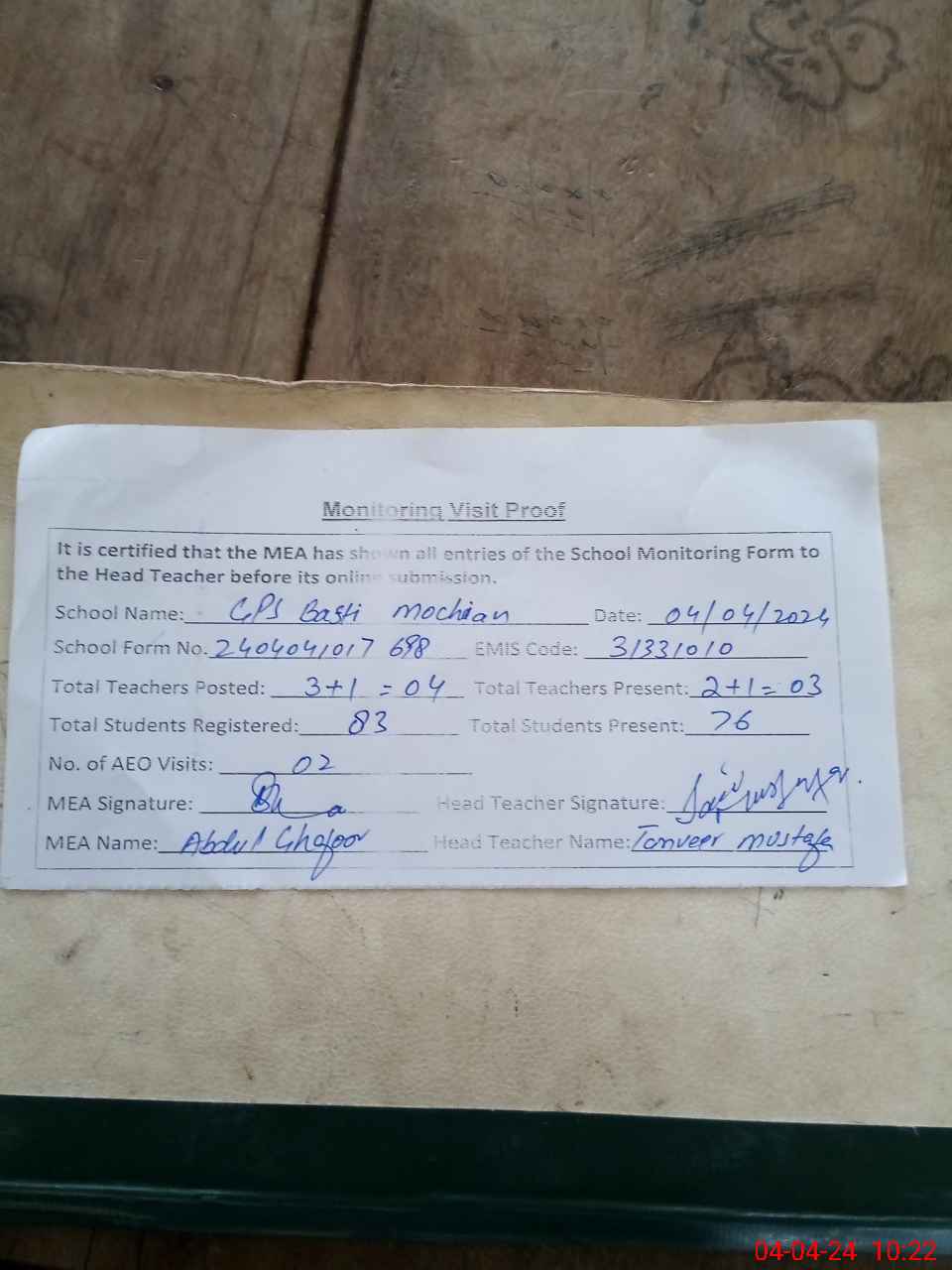 | Attendance Register | Head Teacher | MEA with School | Visit Proof |