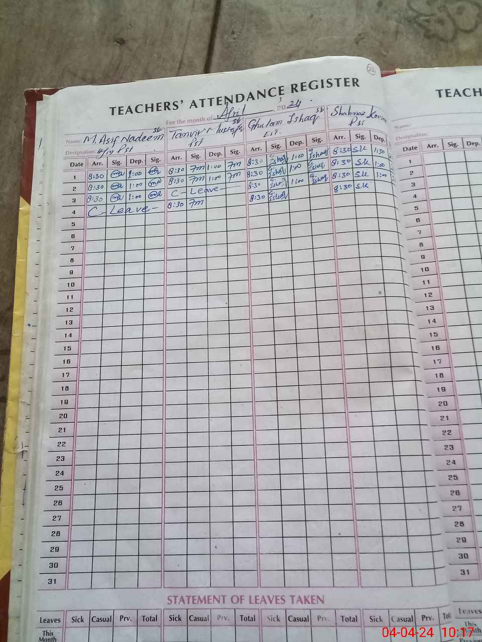 | Leave | Duty | Absent | Maternity | Medical | Ex- Pak |