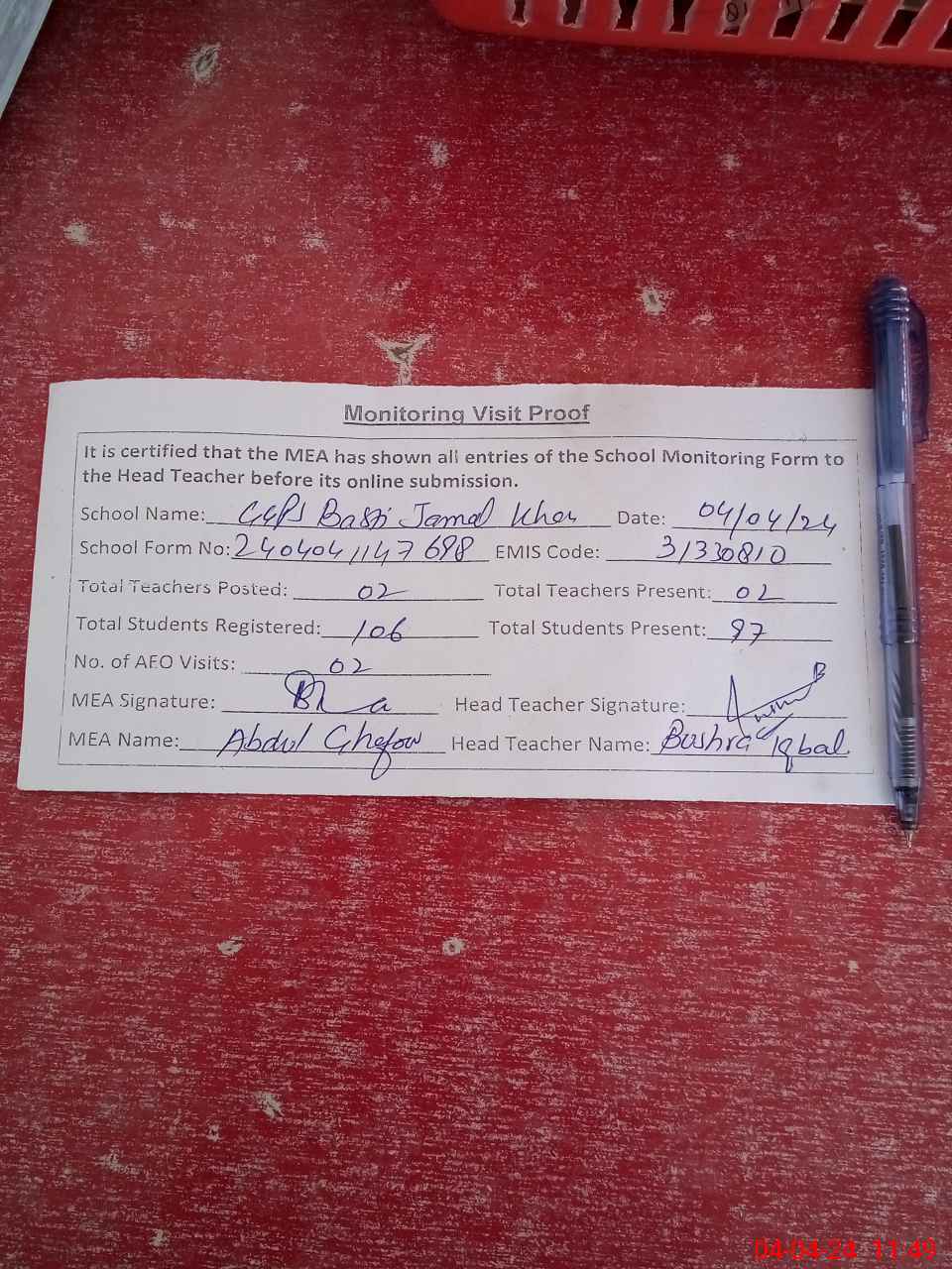 | Attendance Register | Head Teacher | MEA with School | Visit Proof |