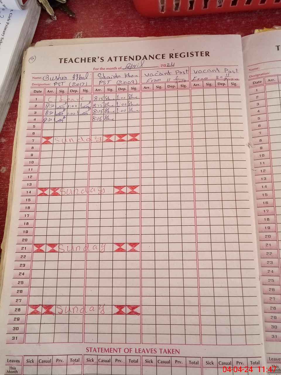 | Leave | Duty | Absent | Maternity | Medical | Ex- Pak |