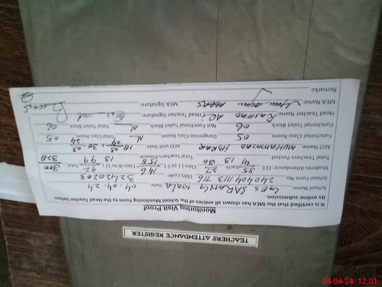 | Attendance Register | Head Teacher | MEA with School | Visit Proof |