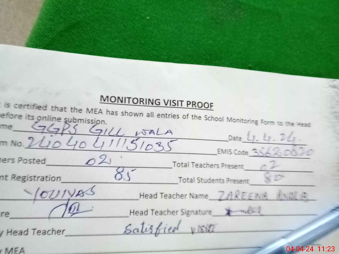 | Attendance Register | Head Teacher | MEA with School | Visit Proof |