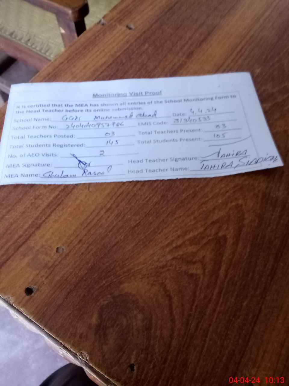 | Attendance Register | Head Teacher | MEA with School | Visit Proof |