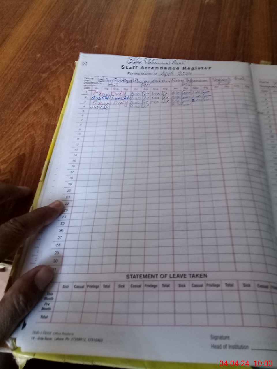| Leave | Duty | Absent | Maternity | Medical | Ex- Pak |