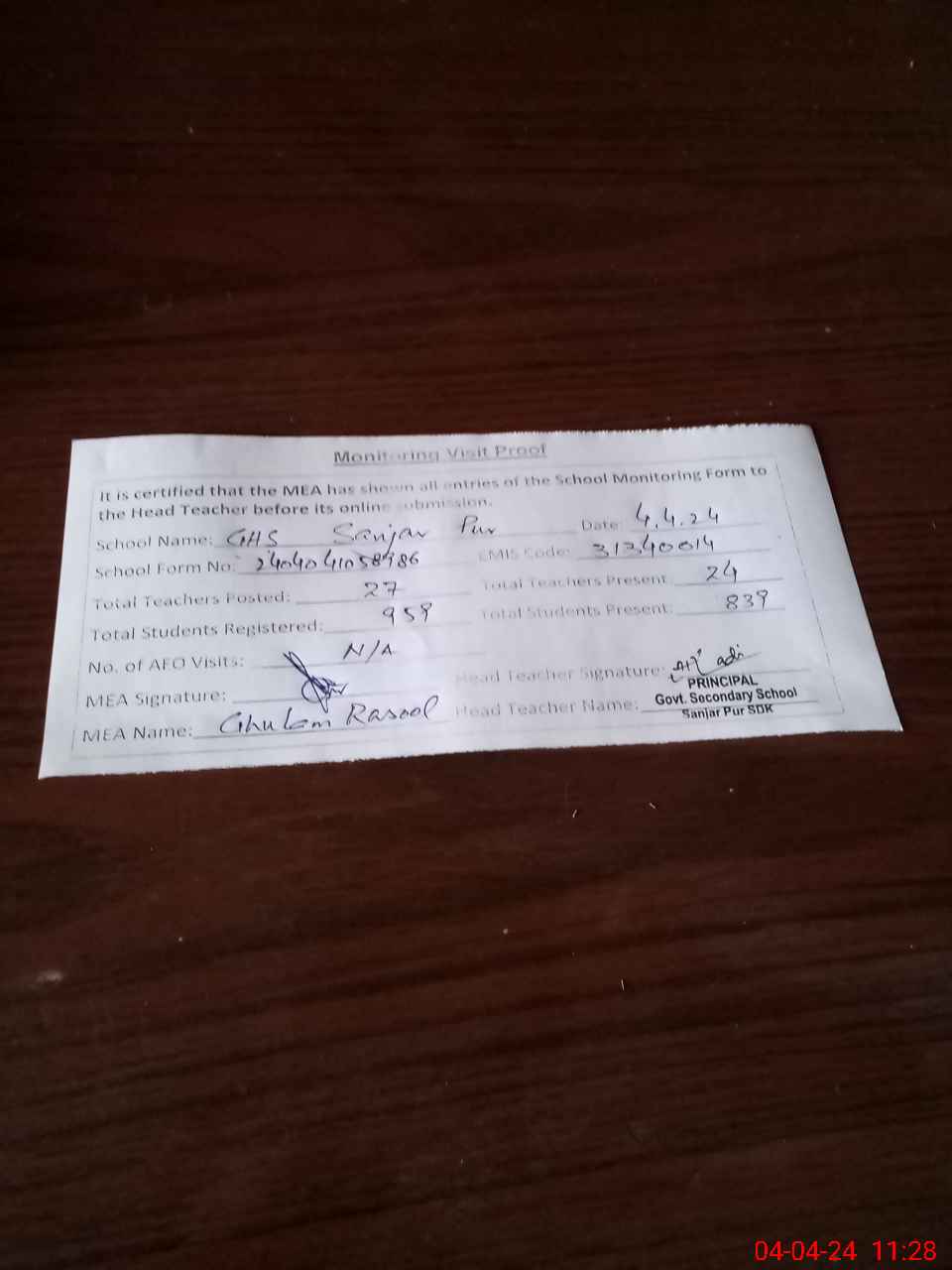 | EMIS Code: 31340014 | Name of School: GHS SANJAR PUR | |||