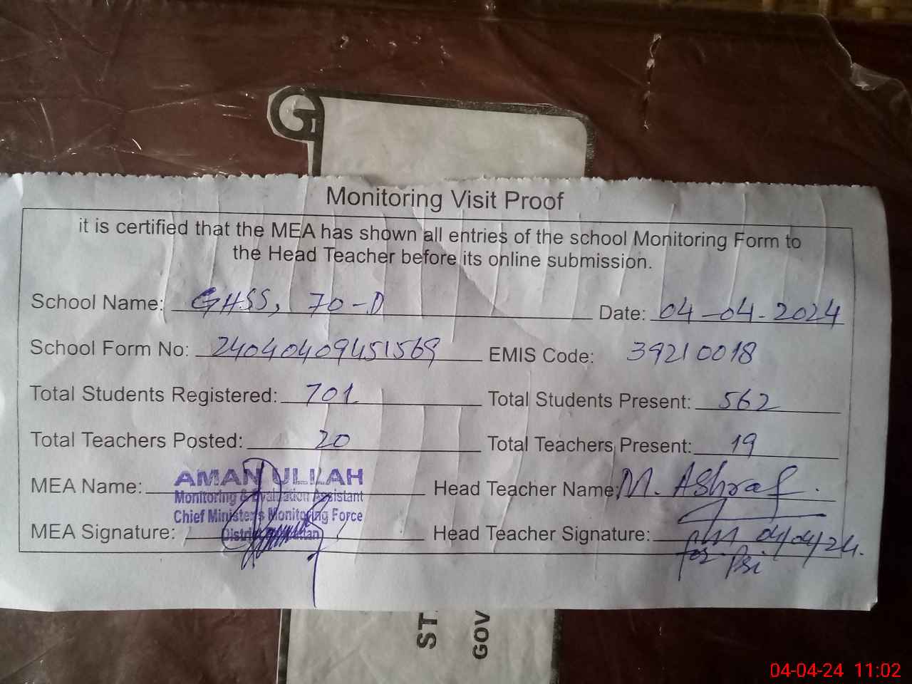 | EMIS Code: 39210018 | Name of School: GHSS 70/D | |||
