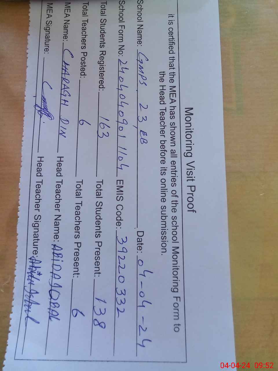 | EMIS Code: 39220332 | Name of School: GMPS CHAK NO. 23 EB | |||