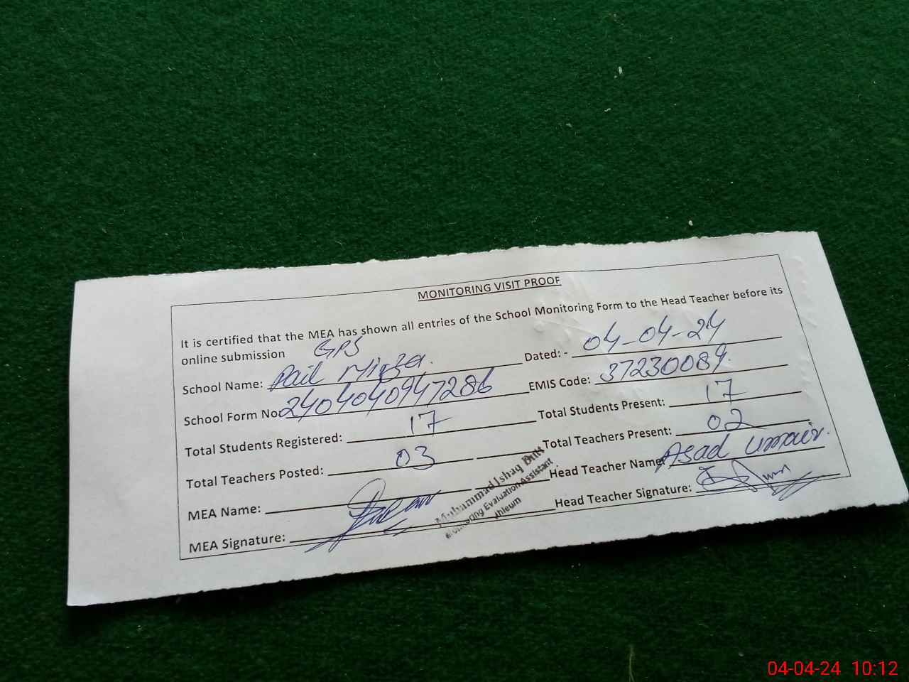 | Attendance Register | Head Teacher | MEA with School | Visit Proof |