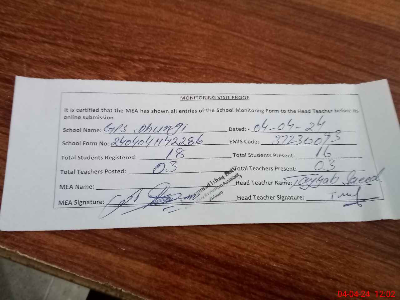 | Attendance Register | Head Teacher | MEA with School | Visit Proof |