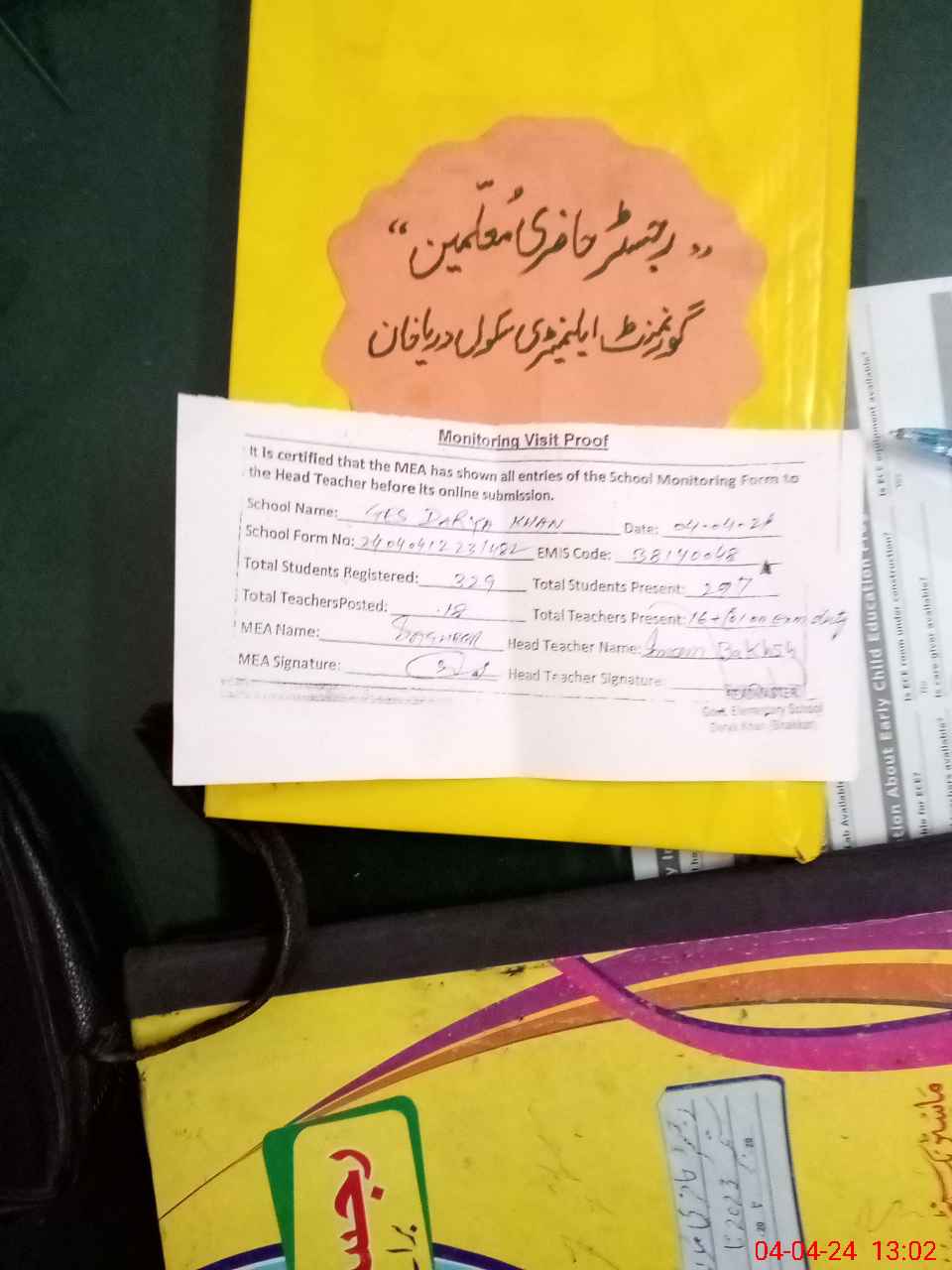 | Attendance Register | Head Teacher | MEA with School | Visit Proof |