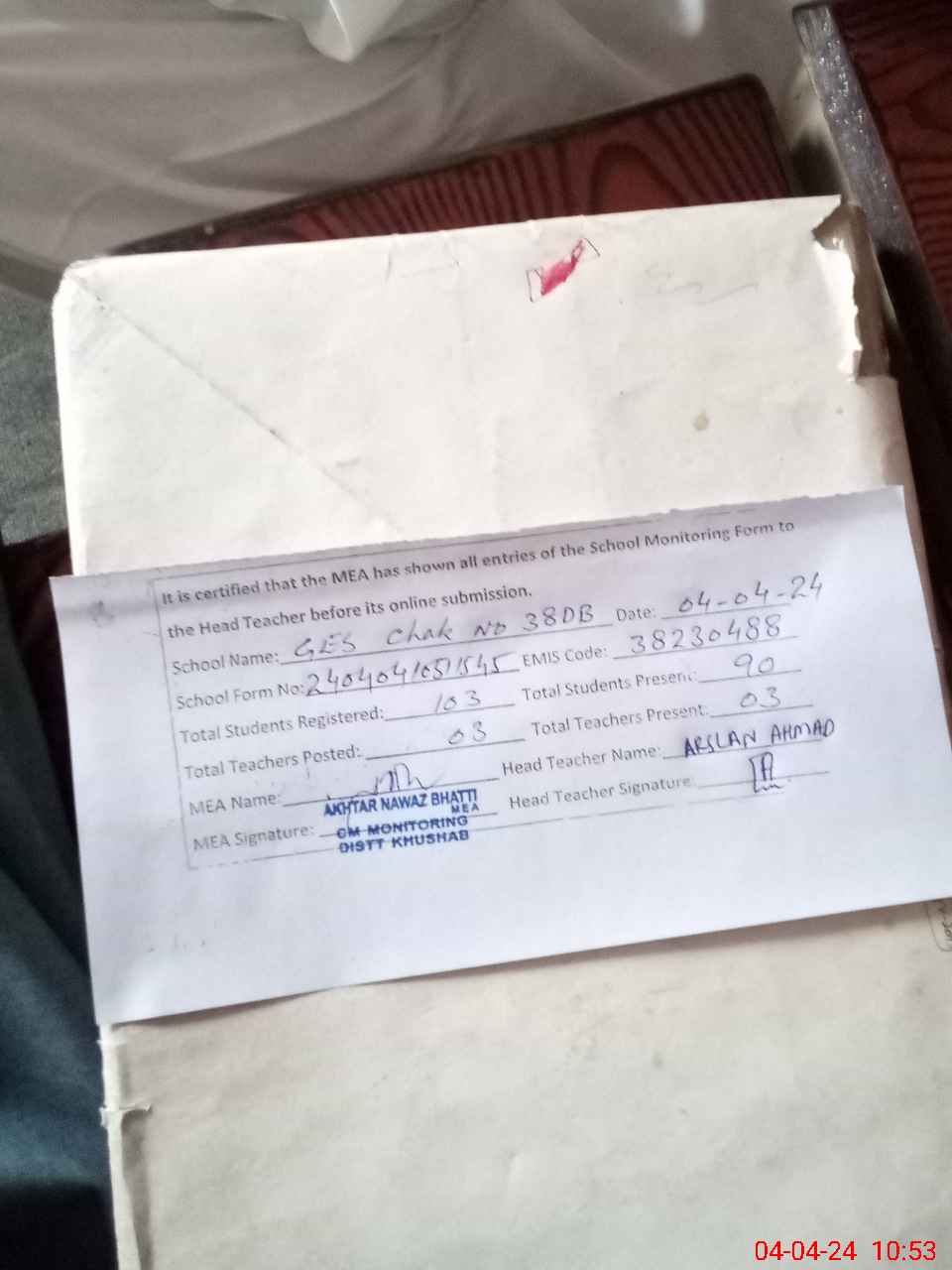 | Monitoring Date: 04-04-2024 | Start Time: 04-04-2024 10:18 AM | End Time: 04-04-2024 10:53 AM | Name of MEA: AK**** NA**** (R**** | |