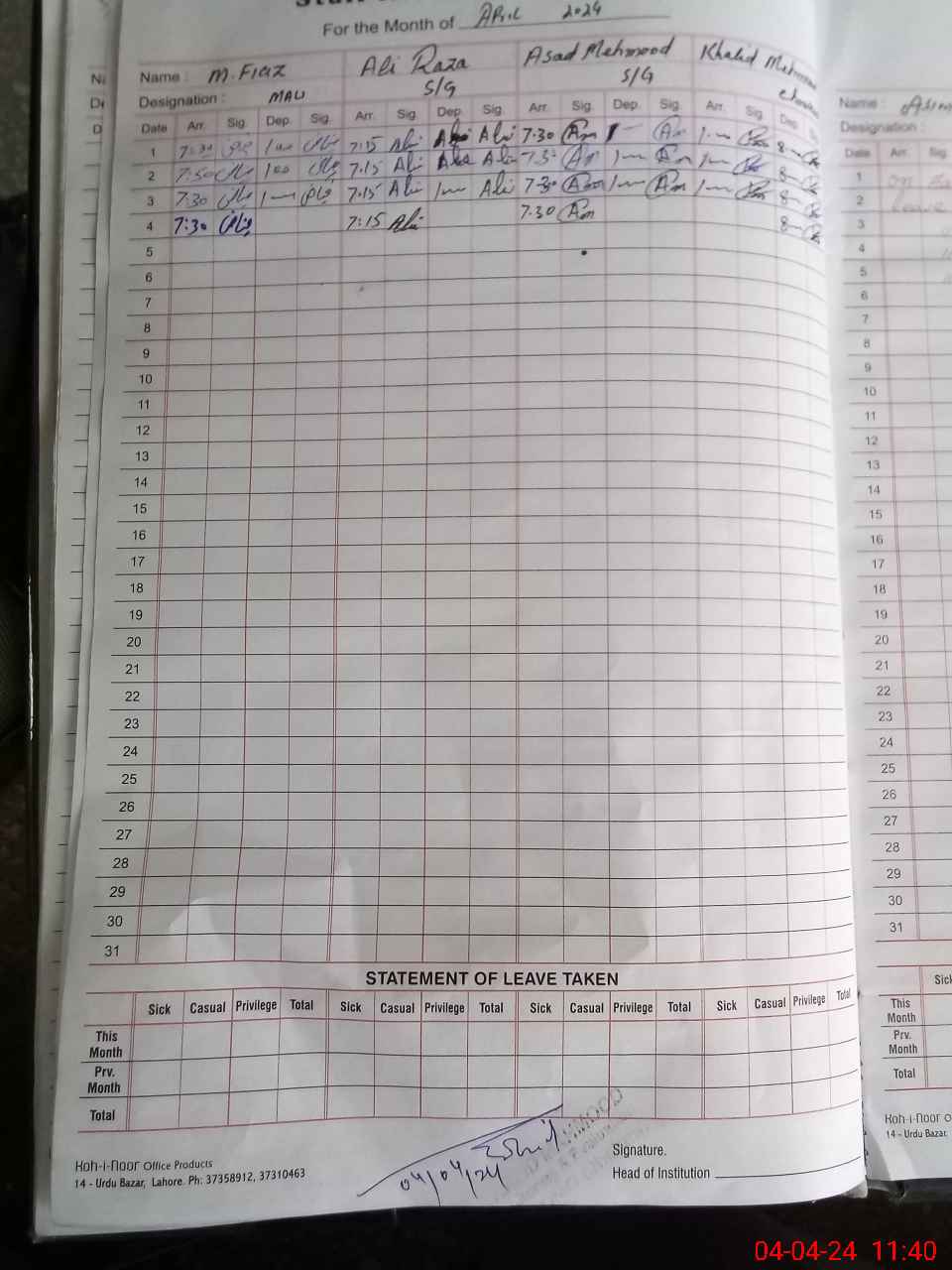 | CNIC | Full Name | Designation | R/C | Absence During Last Calender Month |