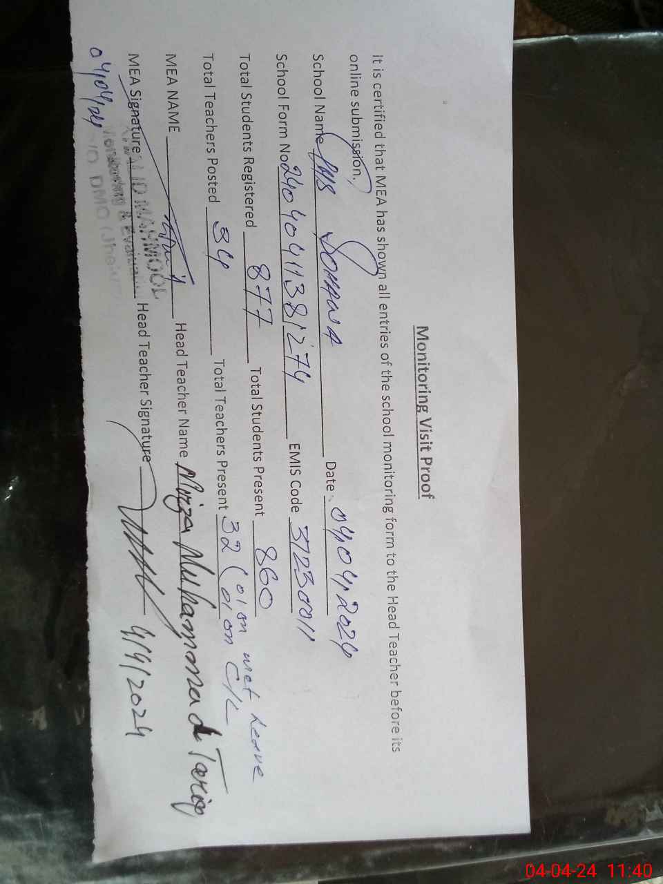 | Attendance Register | Head Teacher | MEA with School | Visit Proof |