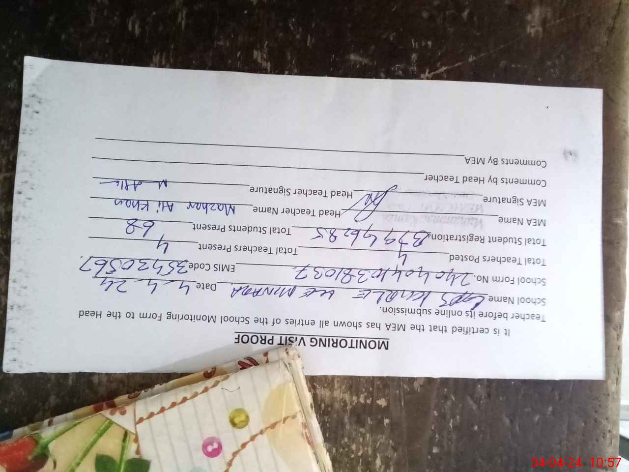 | Attendance Register | Head Teacher | MEA with School | Visit Proof |