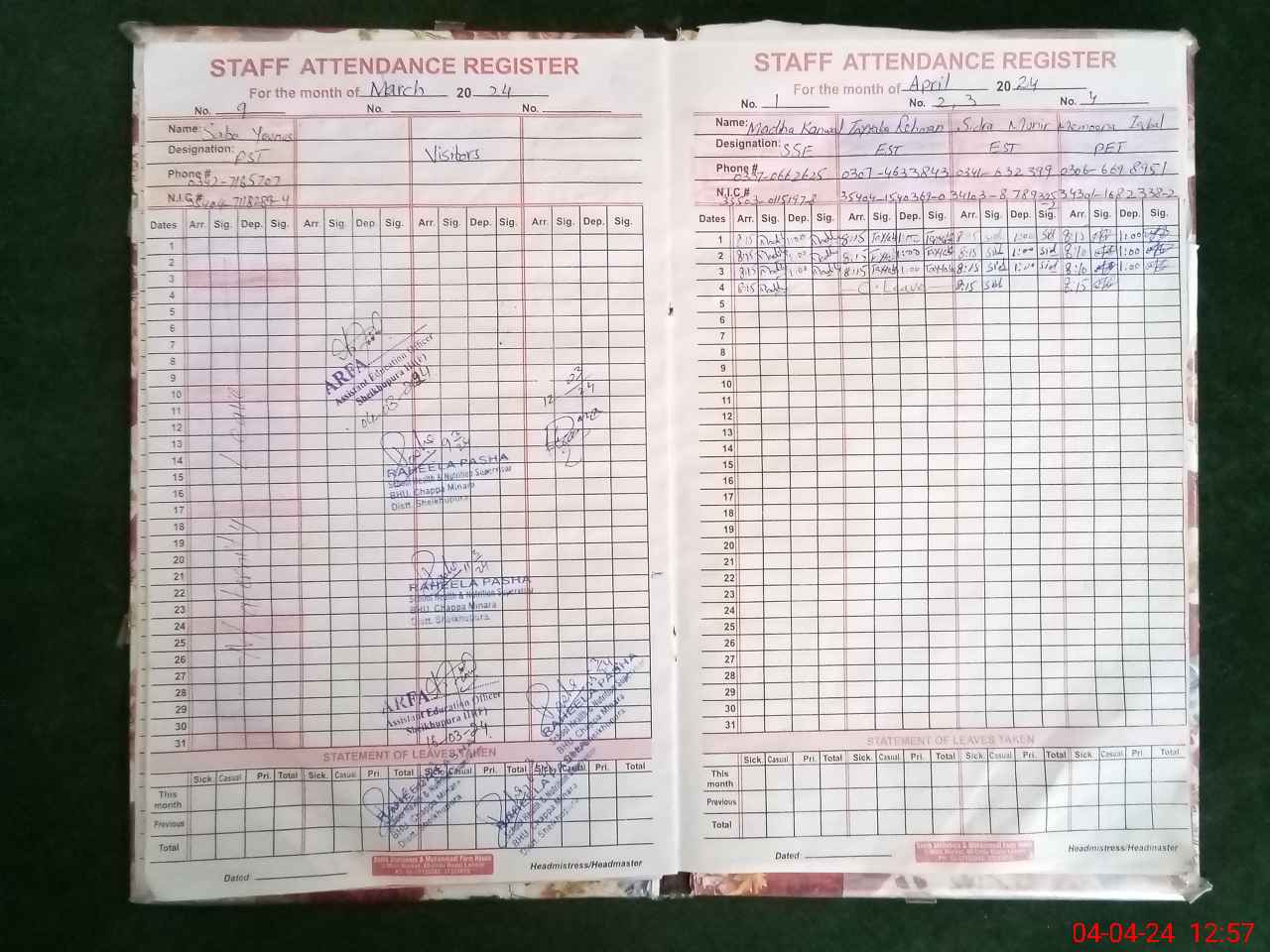 | CNIC | Full Name | Designation | R/C | Absence During Last Calender Month |