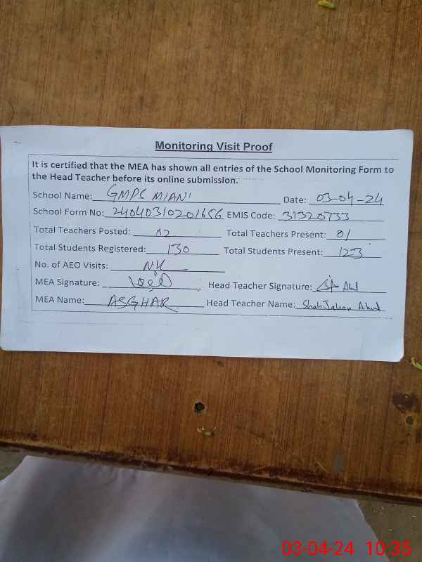 | Certified that this School was Inspected by the Undersigned MEA/DMO Today and the Information Stated Above is as Per Record. | |||||