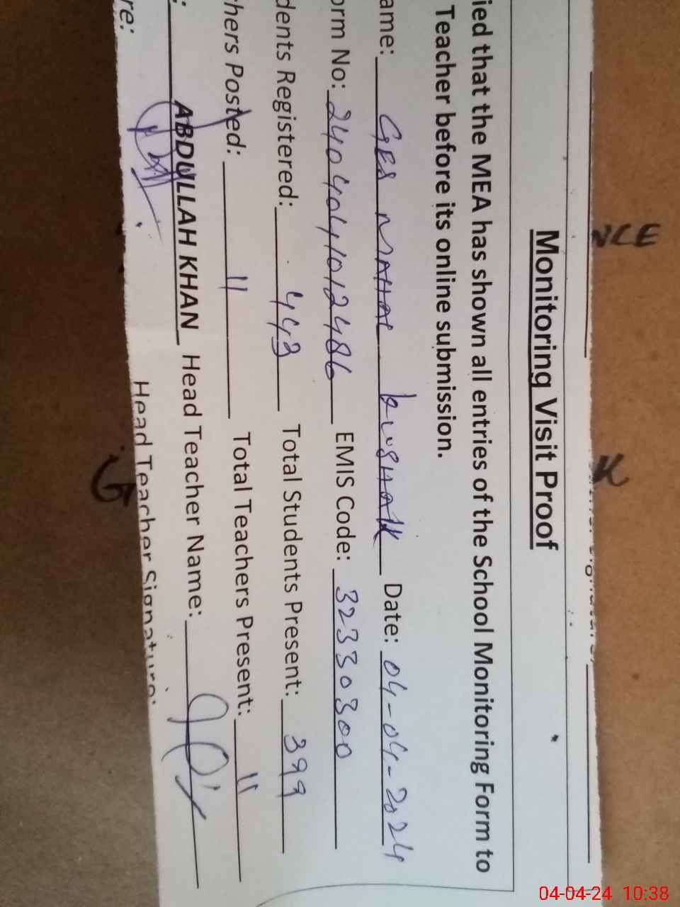 | Attendance Register | Head Teacher | MEA with School | Visit Proof |