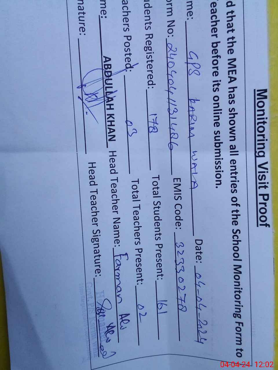 | EMIS Code: 32330278 | Name of School: GPS KARIM WALA | |||