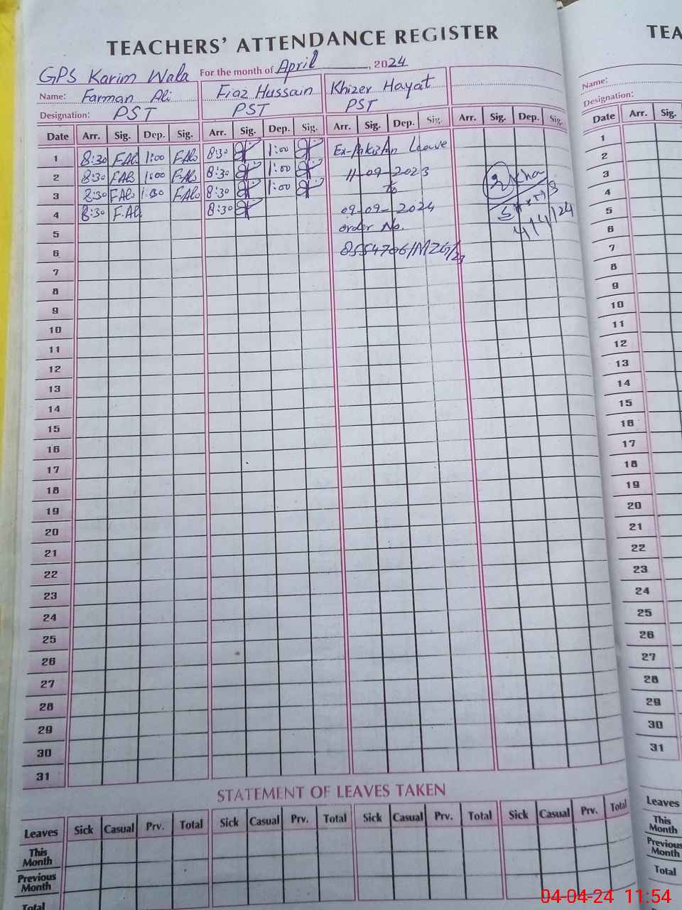 | Leave | Duty | Absent | Maternity | Medical | Ex- Pak |