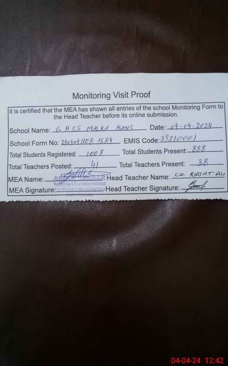 | EMIS Code: 39210001 | Name of School: GHSS MALKA HANS | |||