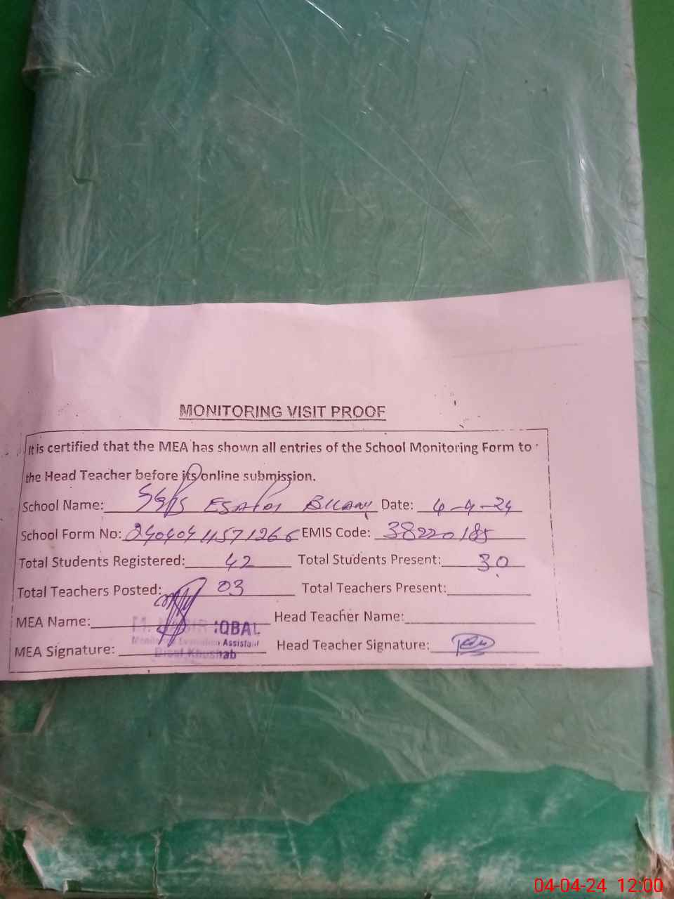 | Attendance Register | Head Teacher | MEA with School | Visit Proof |