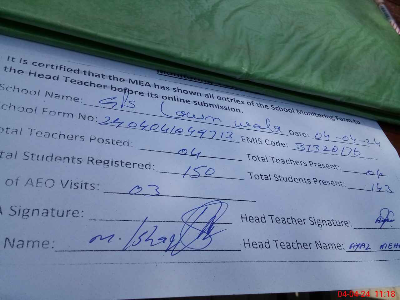 | Attendance Register | Head Teacher | MEA with School | Visit Proof |