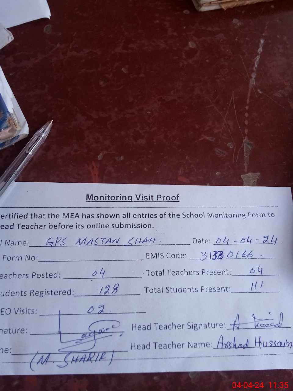 | Attendance Register | Head Teacher | MEA with School | Visit Proof |