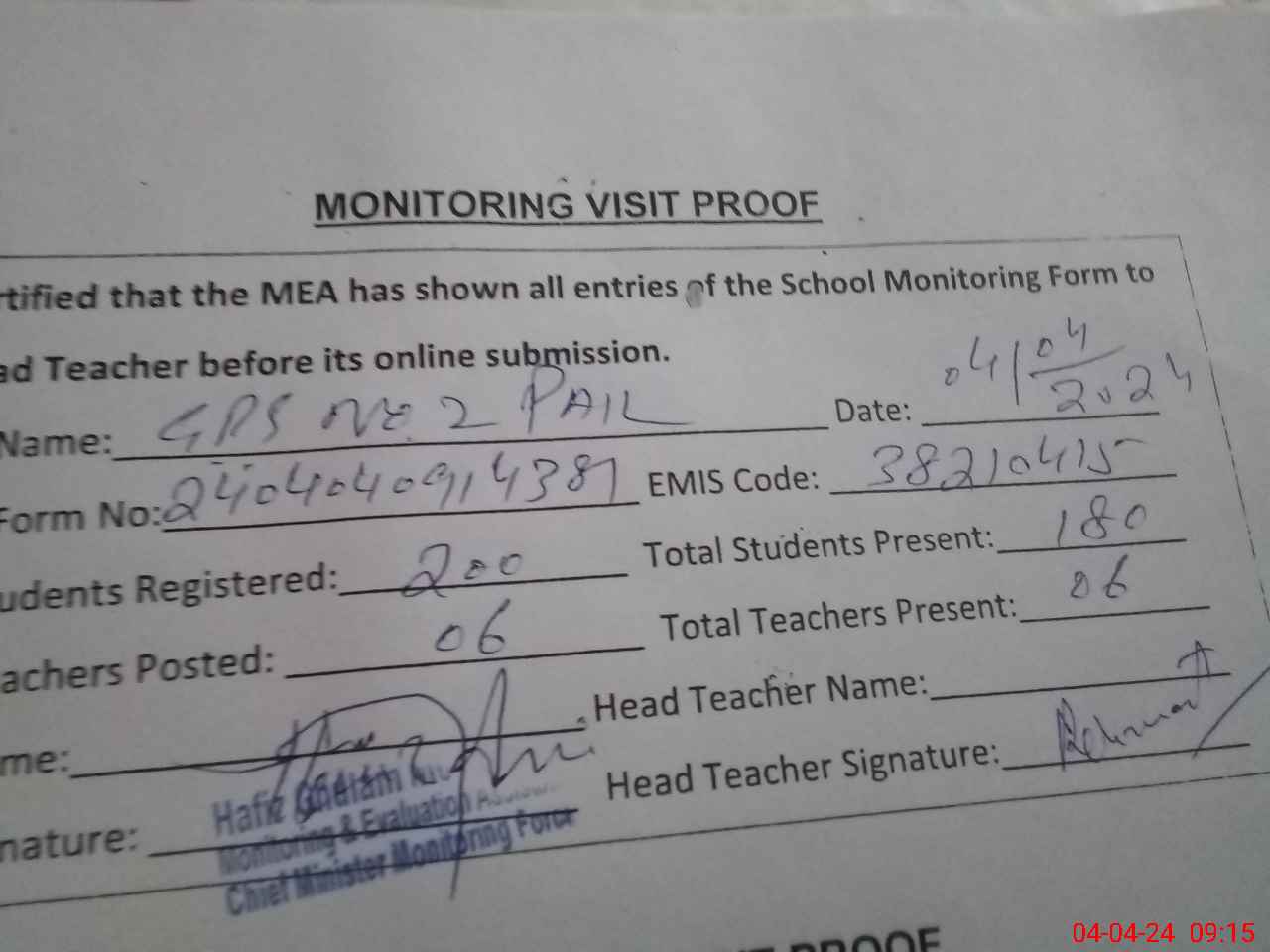 | Attendance Register | Head Teacher | MEA with School | Visit Proof |
