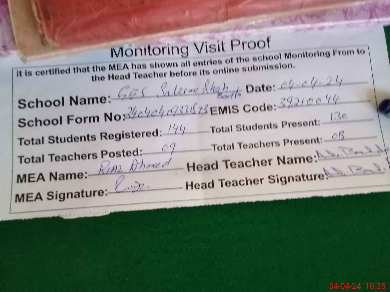 | Attendance Register | Head Teacher | MEA with School | Visit Proof |