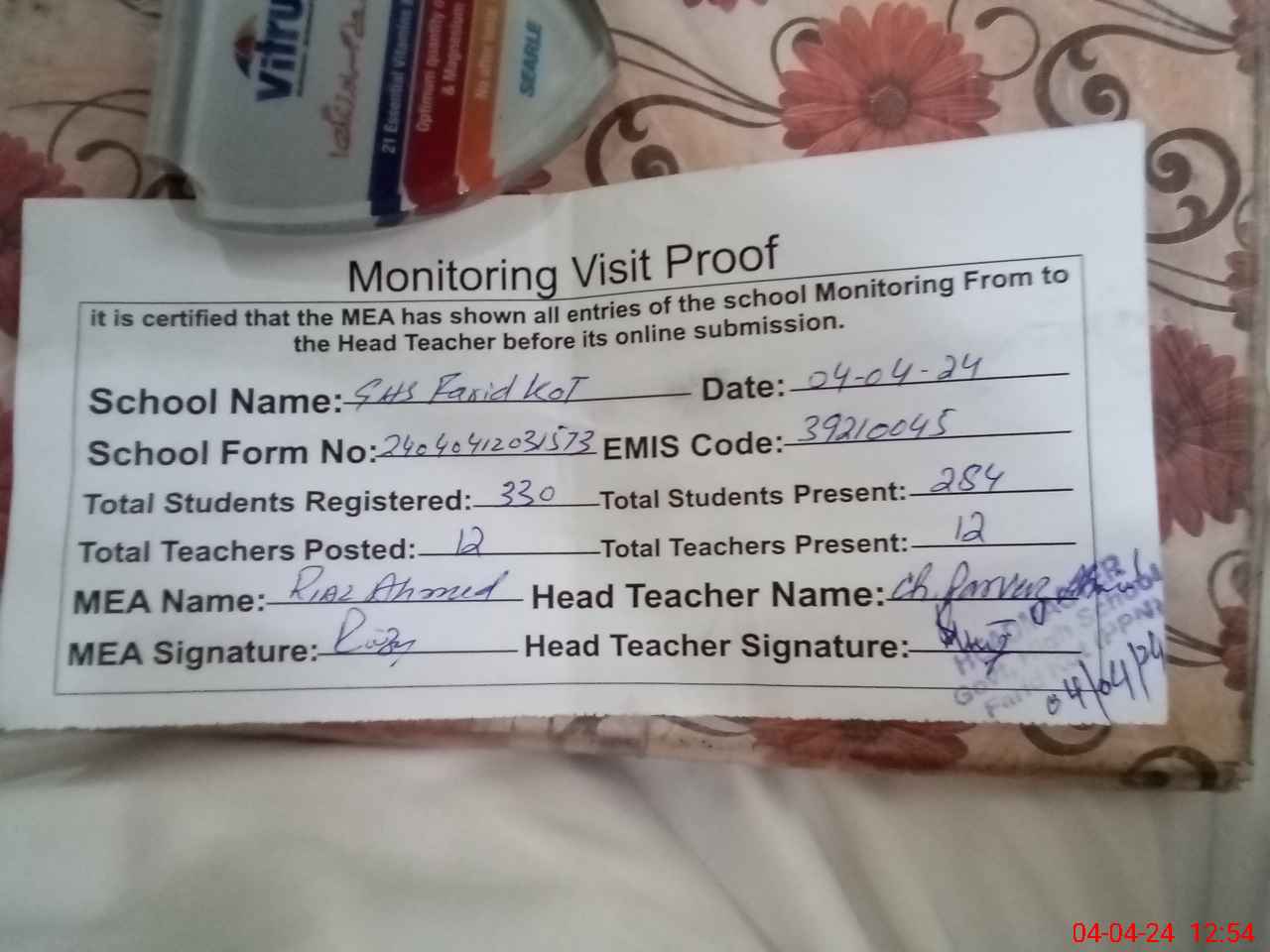 | EMIS Code: 39210045 | Name of School: GHS FARID KOT P/O PAKPATTAN | |||